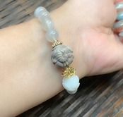 チビガネーシャちゃんと 同系色の回紋珠を つやぷるの8mm ホワイトムーンストーンでぐるりと 贅沢に囲み いつもの大好きな 蓮さんでポイントを付けました♡ 控えめなお色が どなたにでもあいます