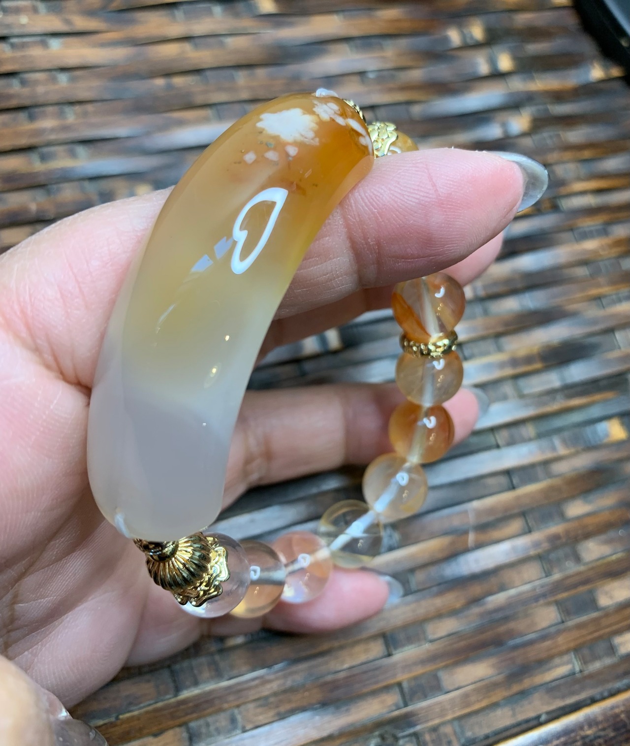 しっかりお花が入った桜めのうのプレートブレス です